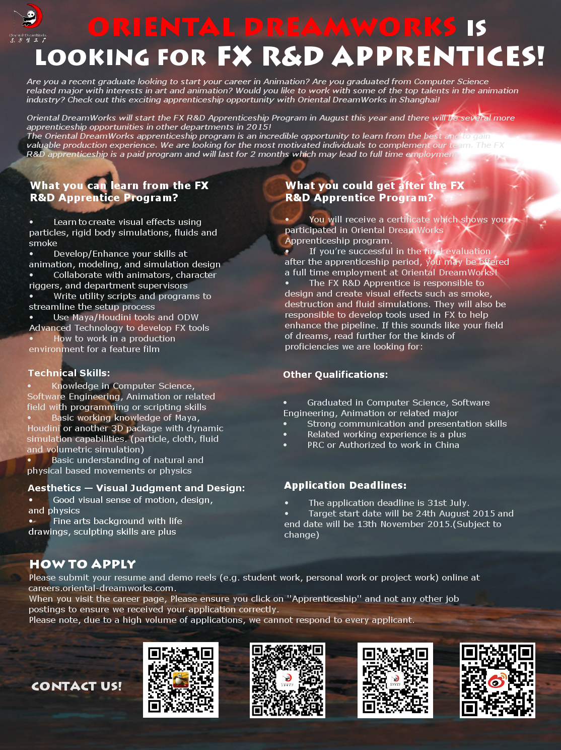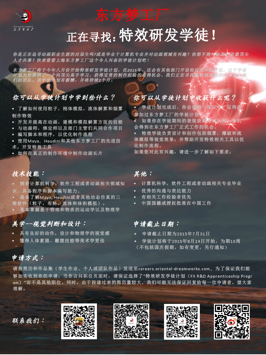 上海东方梦工厂即将开始特效研发FX R&D学徒计划招聘,项目时间是8/24 -11/13,共10周,一共招聘8人。